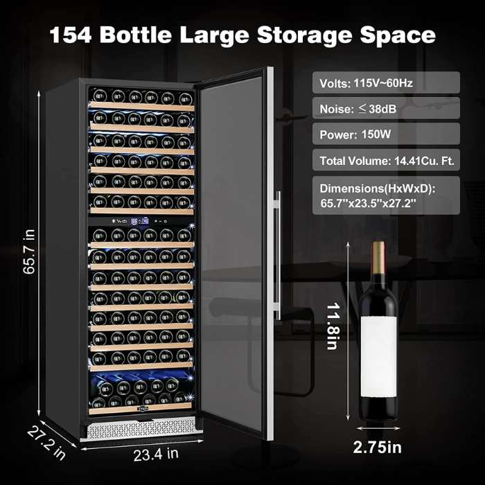 - This particular model has a large size but a smaller capacity, only able to hold up to 150 bottles. Other models listed above have more spacious storage capabilities.
