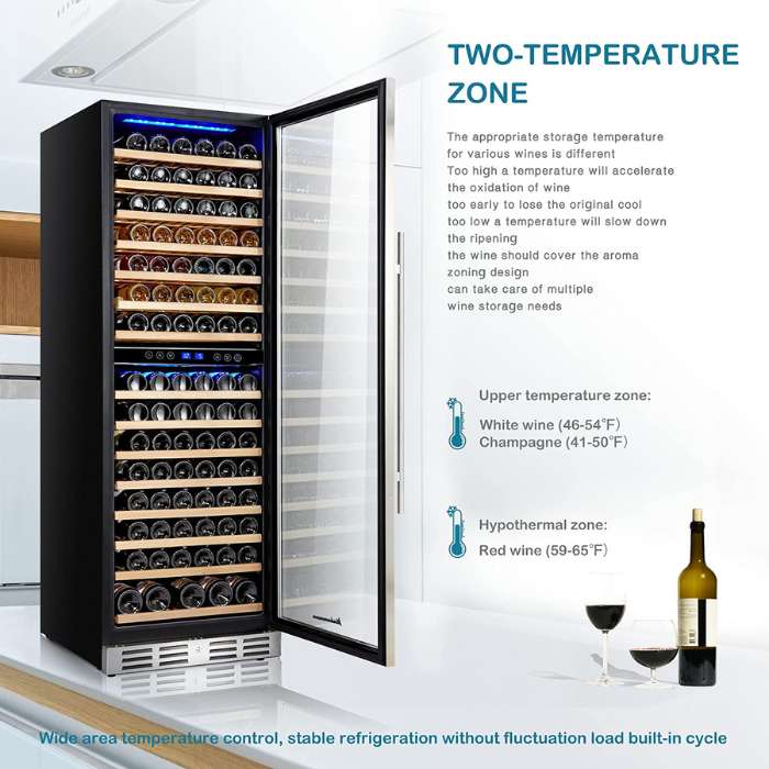 - The dual-zone design allows you to control the temperature separately for different wine collections that require different temperature ranges. This design can also accommodate larger Champagne bottles.