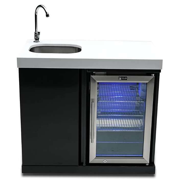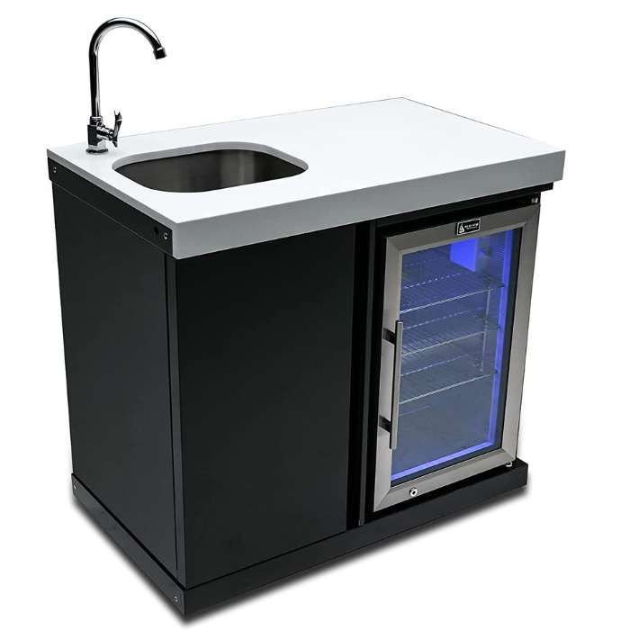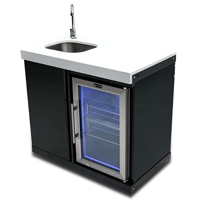 Plus, the built-in sink and faucet make installation a breeze. With its sleek black finish and white granite countertop surfaces, this fridge will be sure to turn heads, but primarily, provide a welcome and cool outdoor entertaining experience for you and your guests.