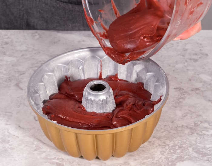 5. Pour batter into prepared bundt cake pan.