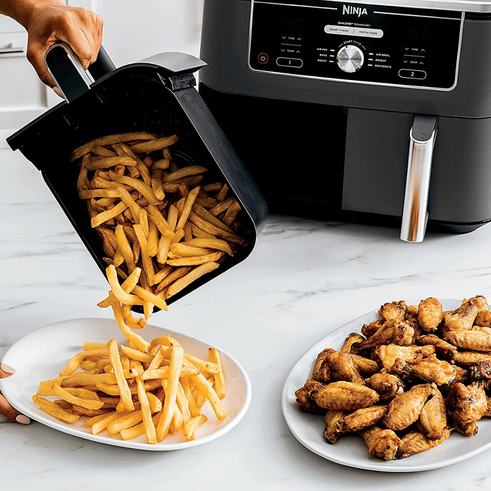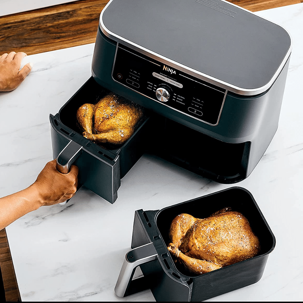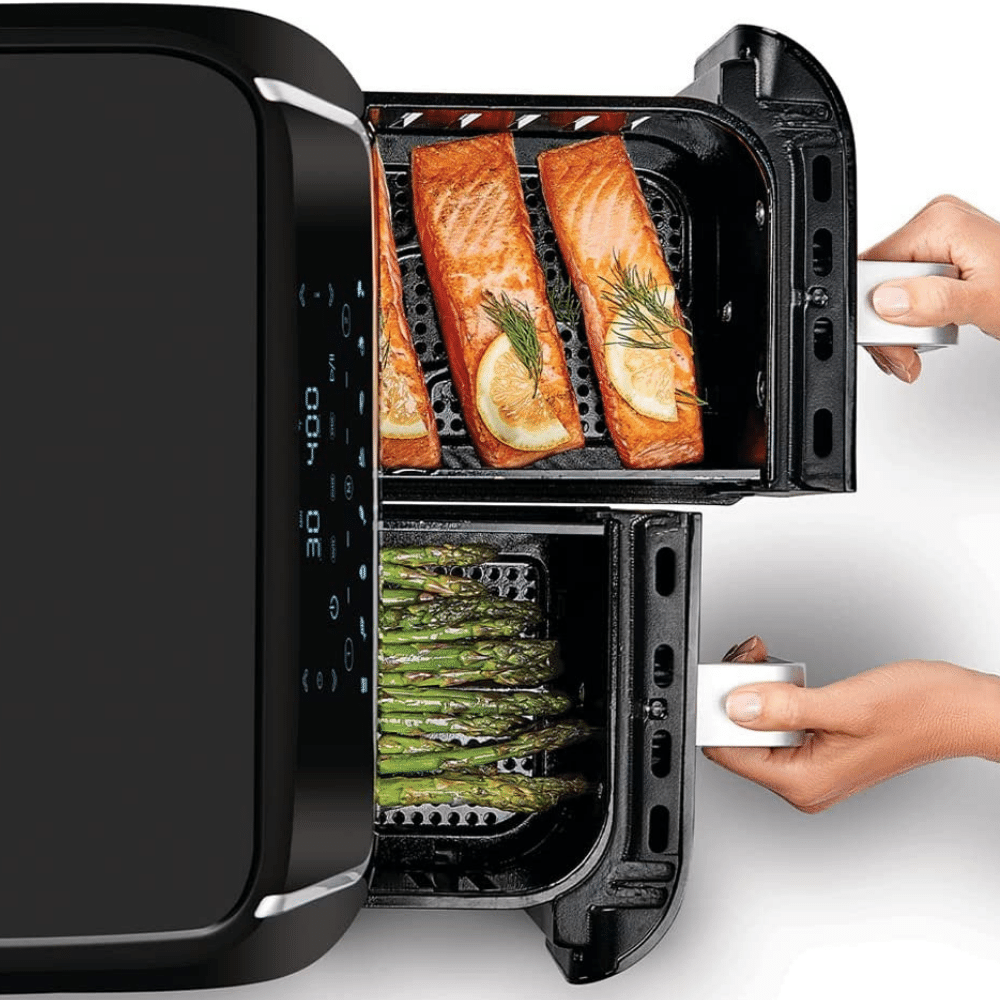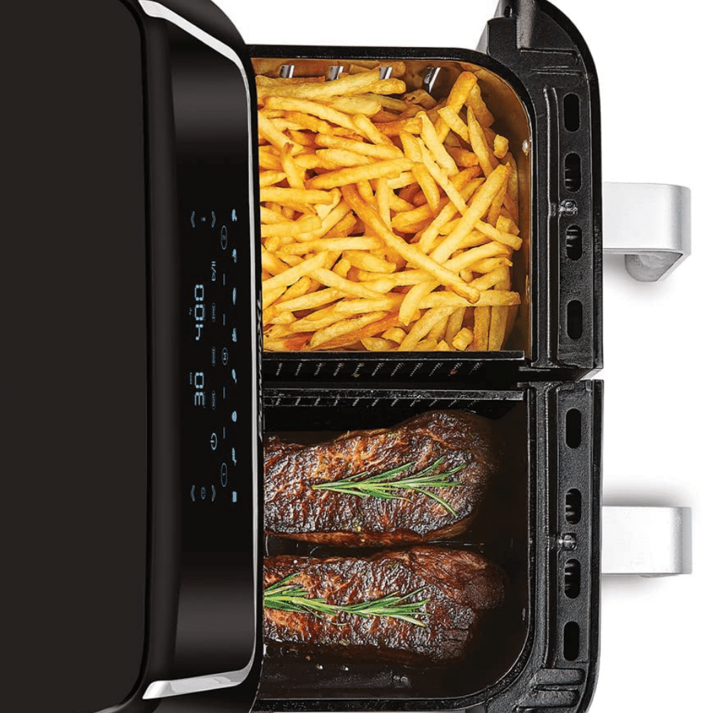 Consider the size of a regular air fryer - 4 - 5.8 quart), this incredibly large air fryer comes with two independent baskets, so you can cook two different foods at the same time – perfect for those who want to eliminate all that extra cooking time.