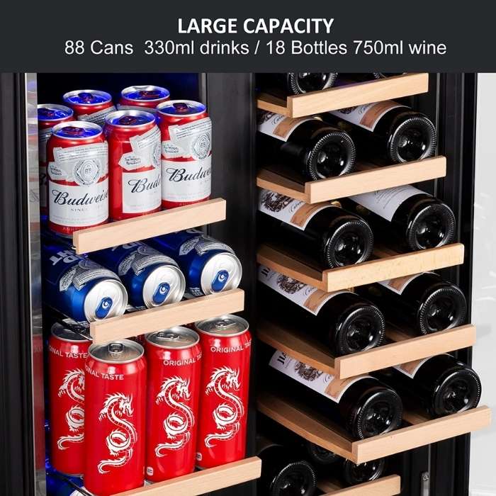 - Large capacity for wine and beverages, so you can keep your collection well-stocked. It has a capacity of holding 20 0.75L wine bottles and 88 of 12oz/330ml standard beverage or beer cans.