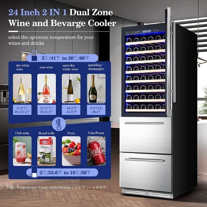 - Beverage coolers with two temperature zones can be used for both beverages (sodas, beers) and wines.