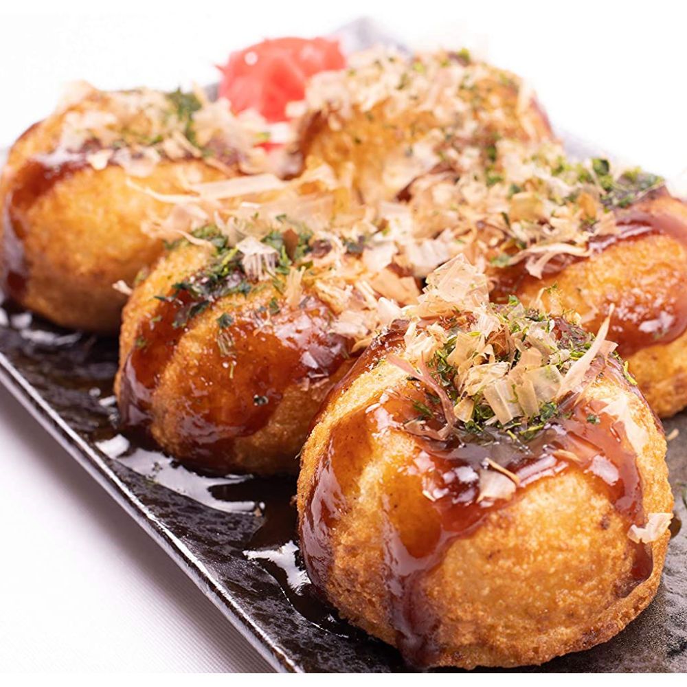 The dish usually contains diced octopus, tempura scraps, pickled ginger, and green onions. Takoyaki is often served with a sweet sauce, mayonnaise, and bonito flakes on top.