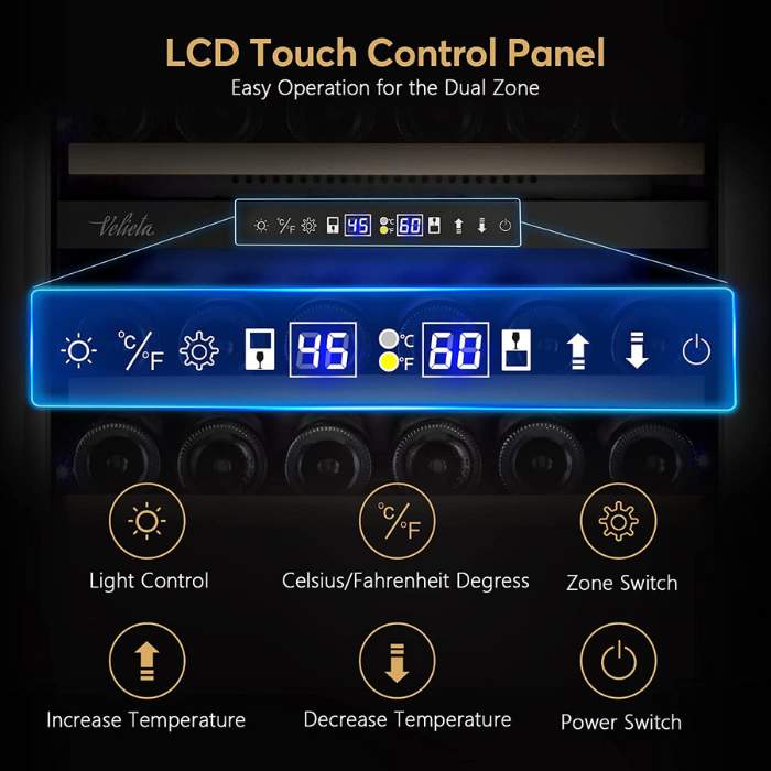 - Its dual zone thermostat allows for separate temperature control between the upper zone (40°-50°F) and lower zone (50°-66°F), ensuring optimal <6 months storage conditions for different types of wine.