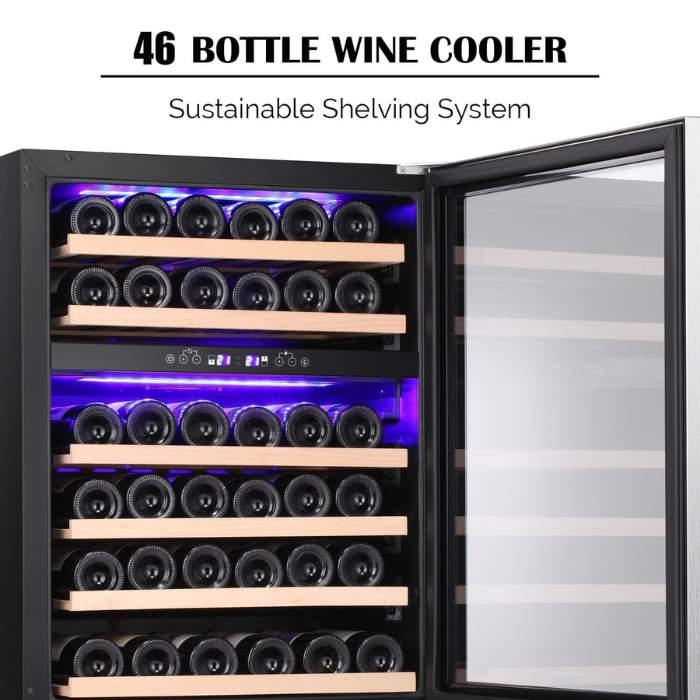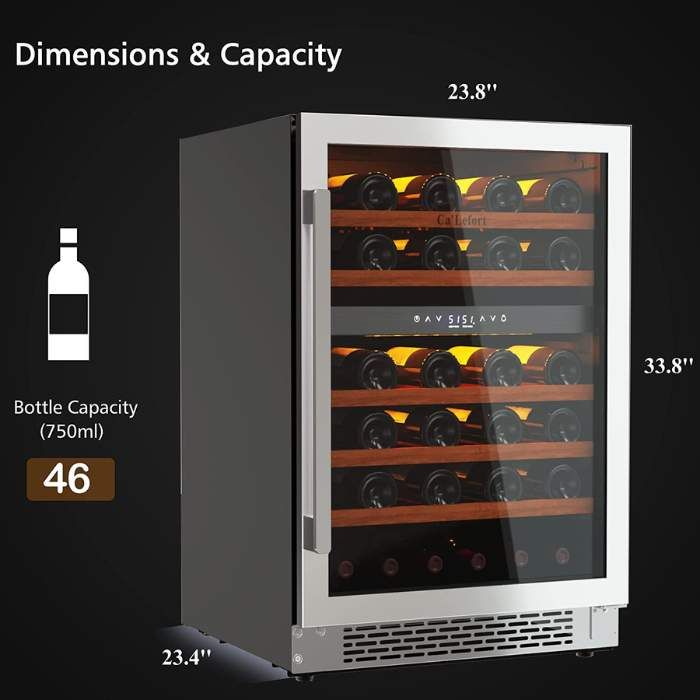 - This freestanding fridge has a spacious 46-bottle capacity, providing ample storage space for different types and sizes of wine without the need to remove any shelves.