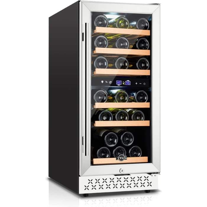 The Tylza compact wine cooler is an ideal choice for those looking to store up to 30 standard-sized bottles of wine in a dual-zone environment.