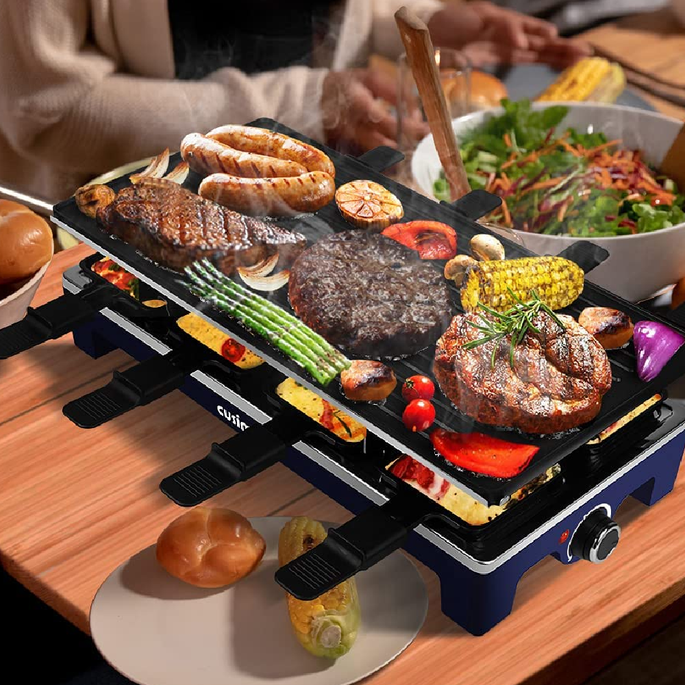 You can grill with grill marks, or make crepes, pancakes, and eggs. This indoor electric grill can be used to make raclette dishes, desserts, and other meals, as well as to keep food warm.