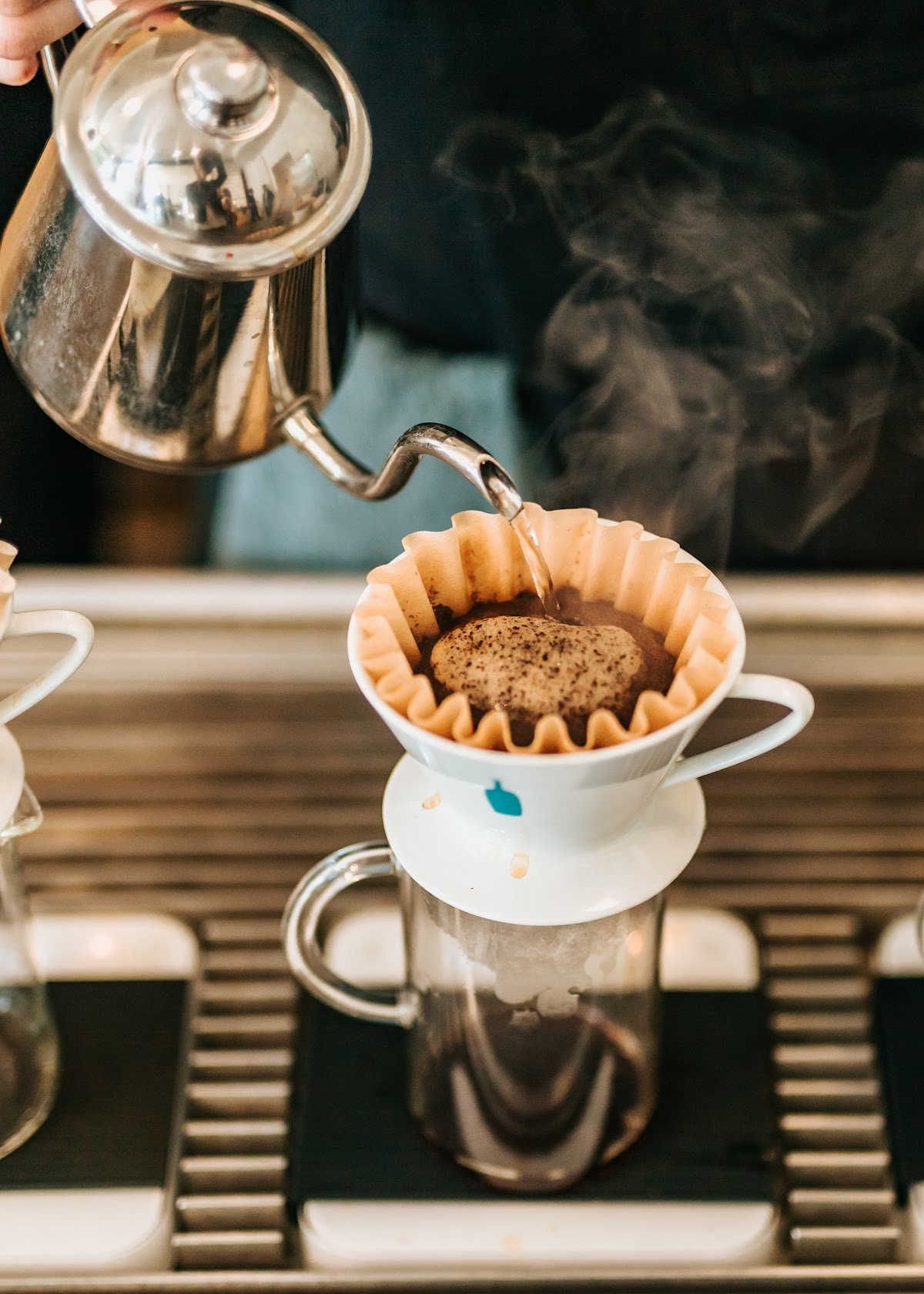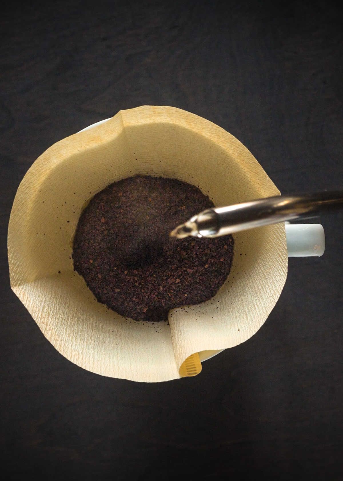 - Next, place the gooseneck kettle over the coffee filter and begin pouring slowly in a circular motion.