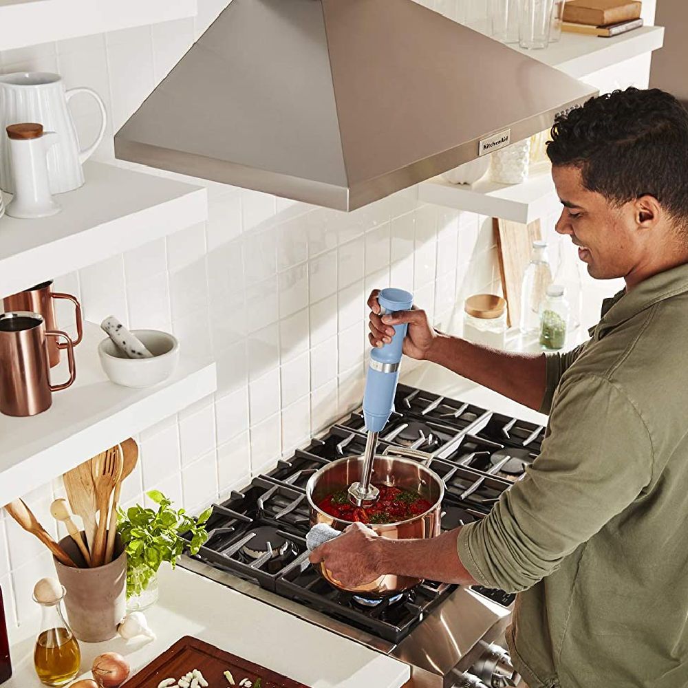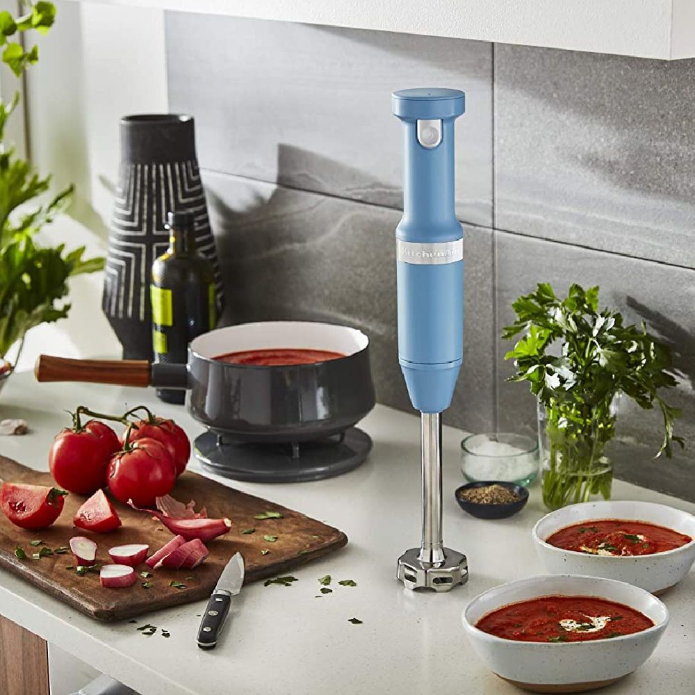 The KitchenAid Cordless Hand Blender is best choice for its variety of colors. It blends 25 bowls of soup on a full charge, and with a quick charge of 20 minutes, you can easily make a triple berry smoothie or a tomato basil soup, or emulsify two liquids to make egg yolk, mayonnaise or butter.