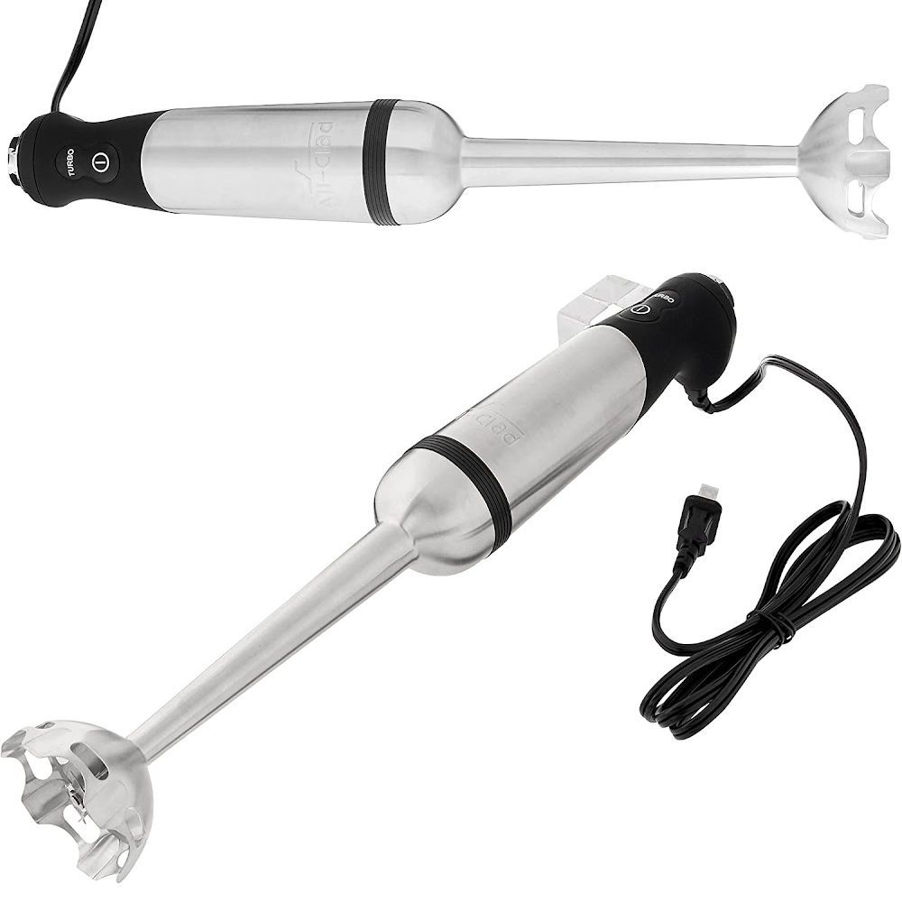 The All-Clad Stainless Steel Immersion Blender comes with a 600W motor and a variable speed control dial, power and turbo settings, plus a pulse function for added control. It's a cordless model: the short cord you see in the picture is for recharging. This makes it portable, and you don't need to handle a long power cable.