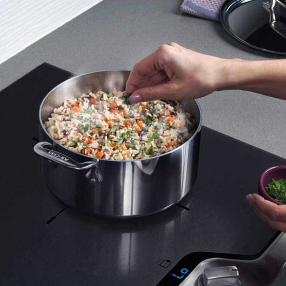 This is a classic tri-ply stainless steel cookware set that's constructed with a responsive aluminum core linked to two layers of long-lasting, stainless steel all the way around for optimum durability and fast, even heat distribution, so your food cooks evenly.