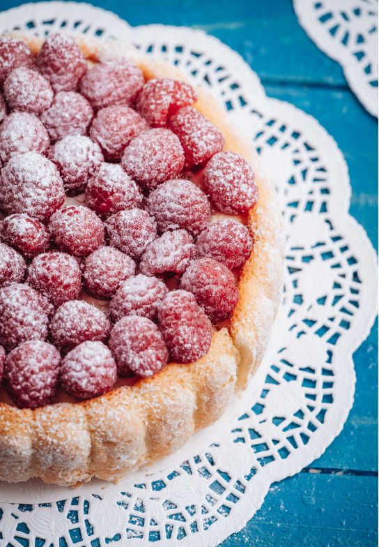 - Evenly distribute the first 1/3 of the raspberries (around 150 gr) over the filling.
