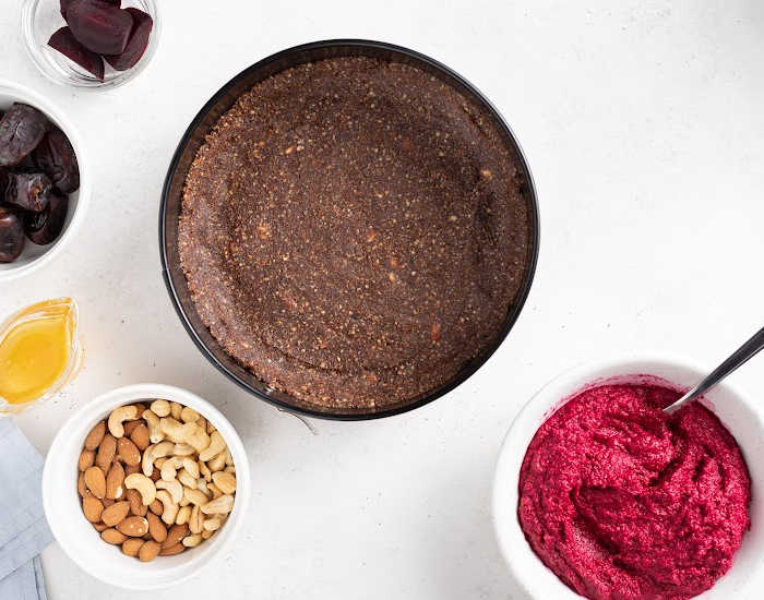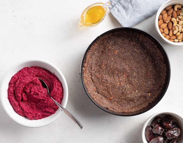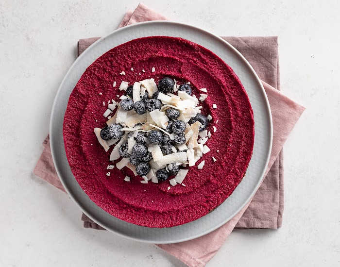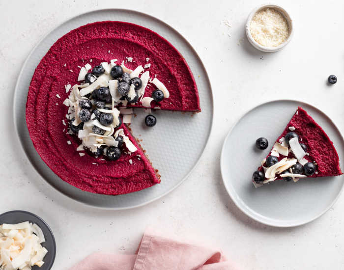 - Watch the video tutorial below to find out how to make the cake base. Once you take it out from the oven, all you need to do is add beet puree on top of the baked base after baking, and then blueberries with shredded coconut. Enjoy!