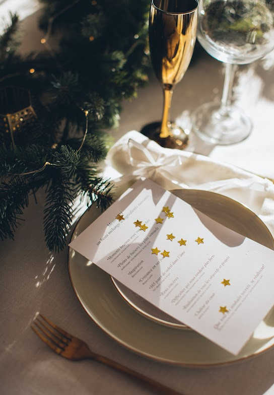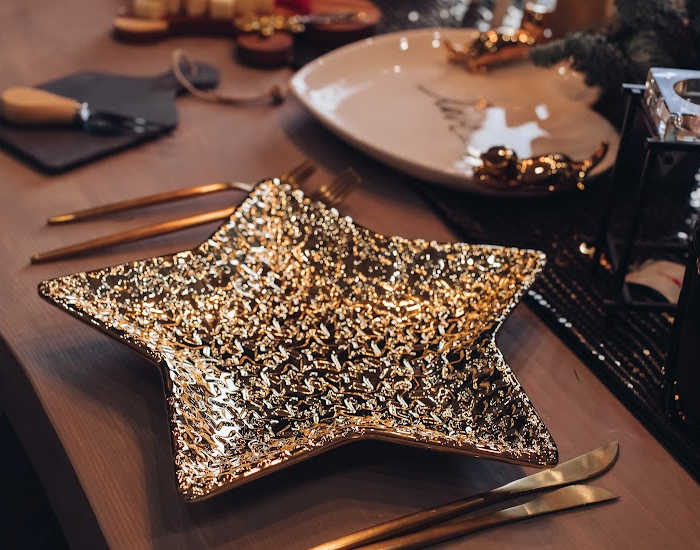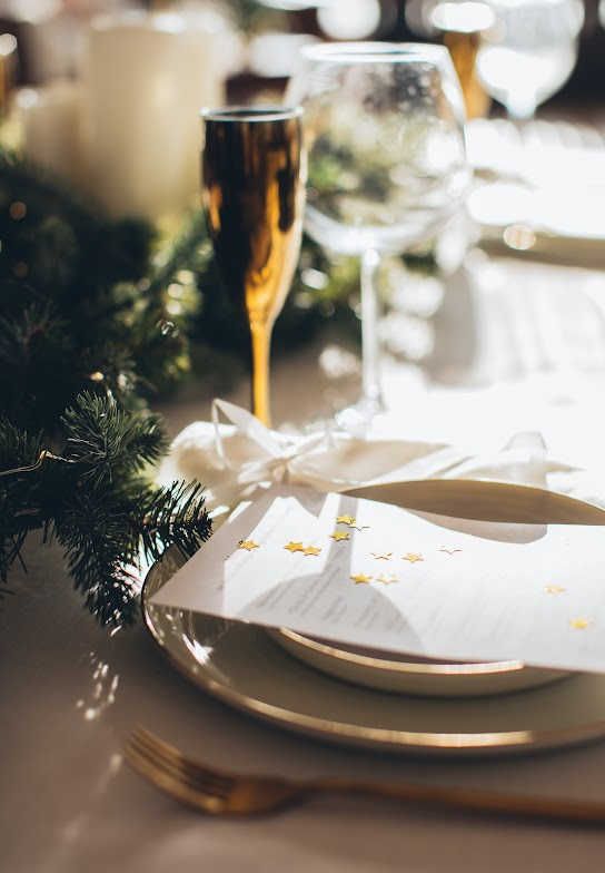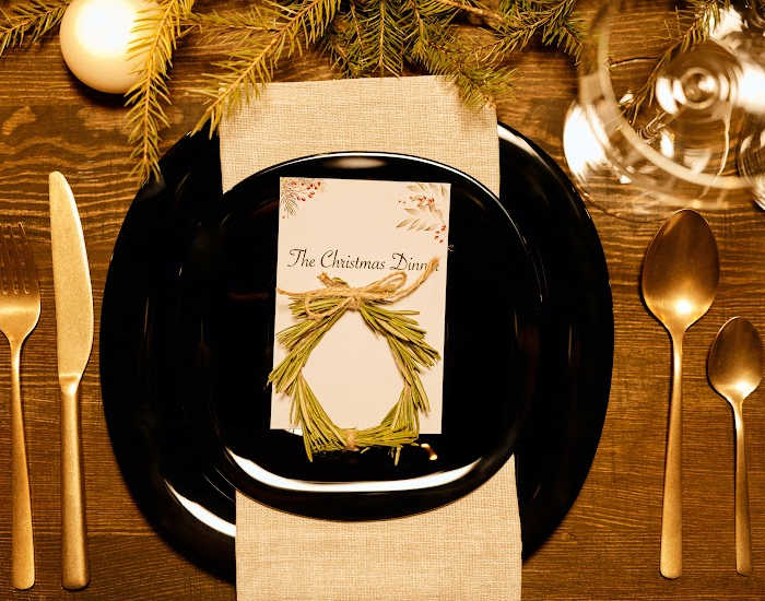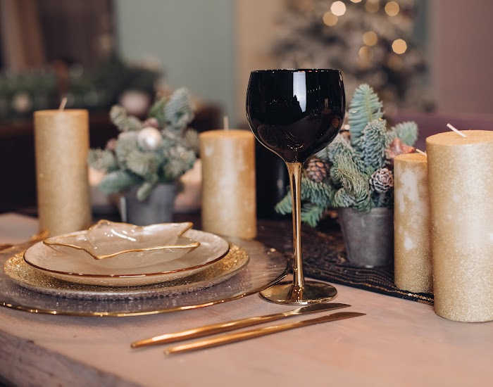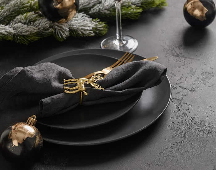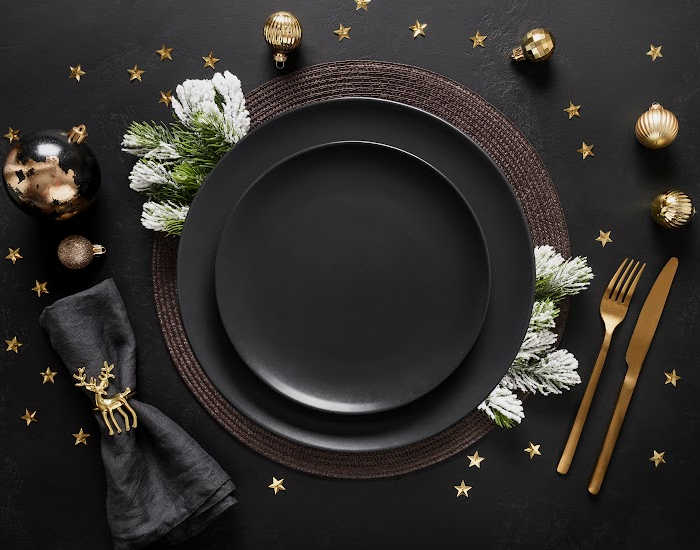 Wanting to switch up your Christmas style this year? Try out a black and gold pairing for your color palette. With a basic black foundation, add in some shimmer with golden plates or golden cutlery.
