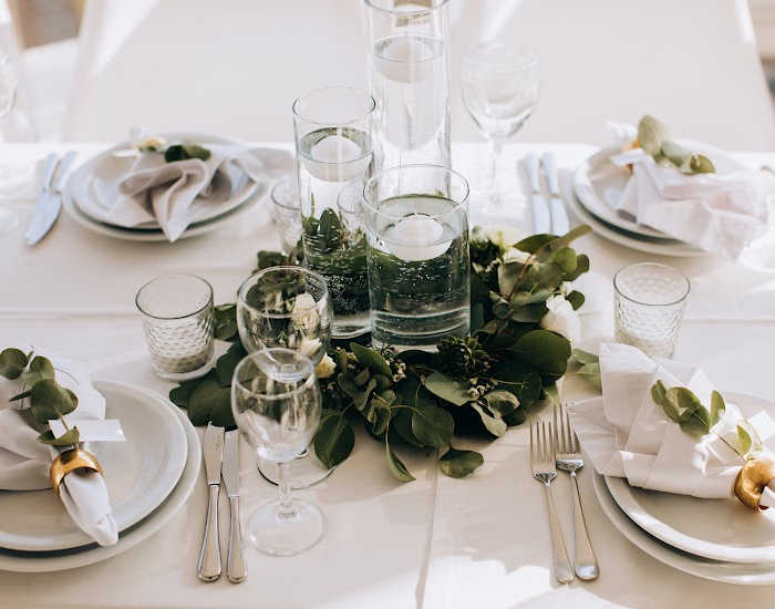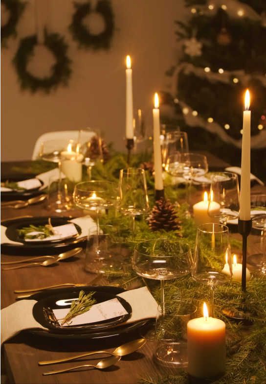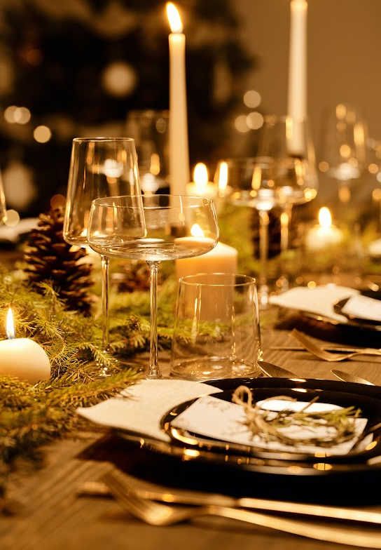 - Then, layer on decorative elements like candles, cutlery, glassware, linens, and centerpieces that bring the design together.