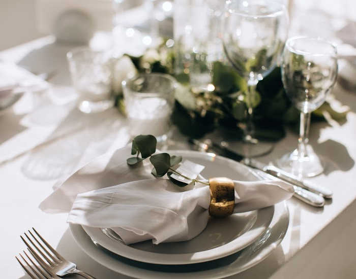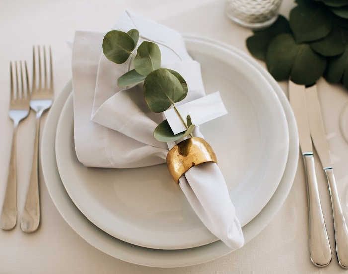 Then add pops of silver or gold with cutlery and glassware. And don’t forget the details—top it off with golden napkin rings, candles in golden candlesticks and small sprigs of greenery in metallic vases for an extra special touch.