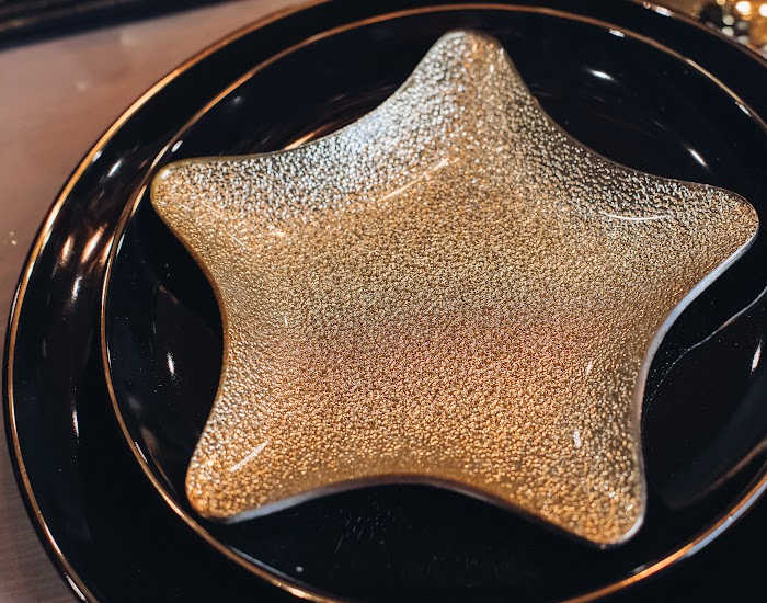 Star-shaped dishes are always festive, so layer those on top of the solid-colored plates. Add mixed-colored glasses that incorporate both black and gold hues.