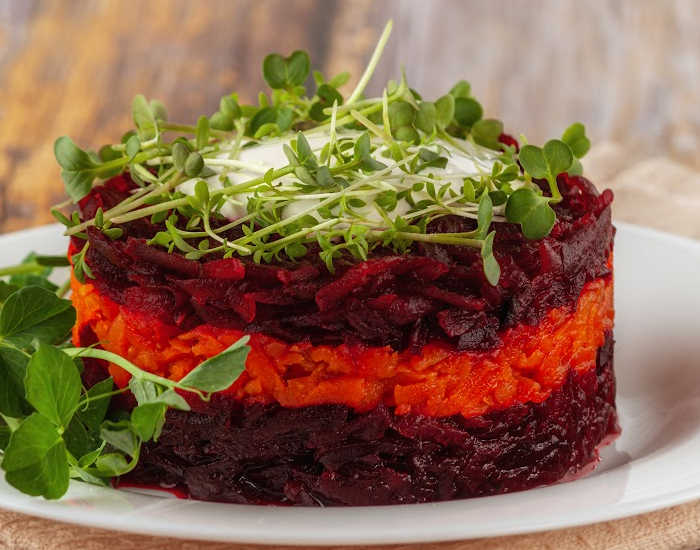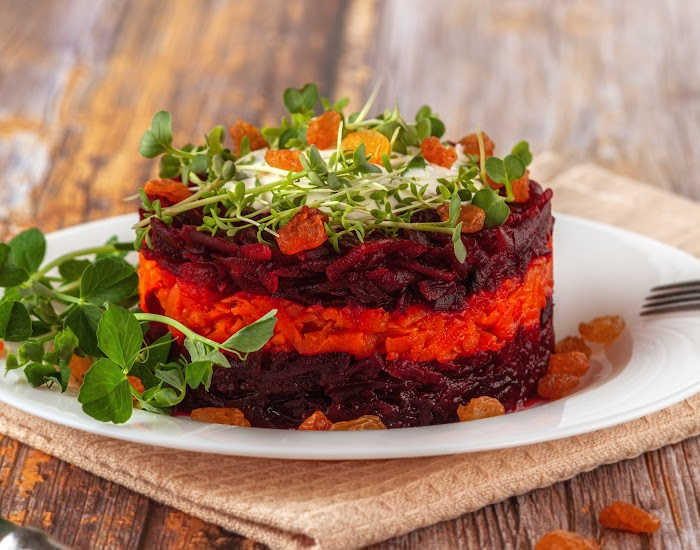 - In a large bowl, mix together the grated beets and carrots.