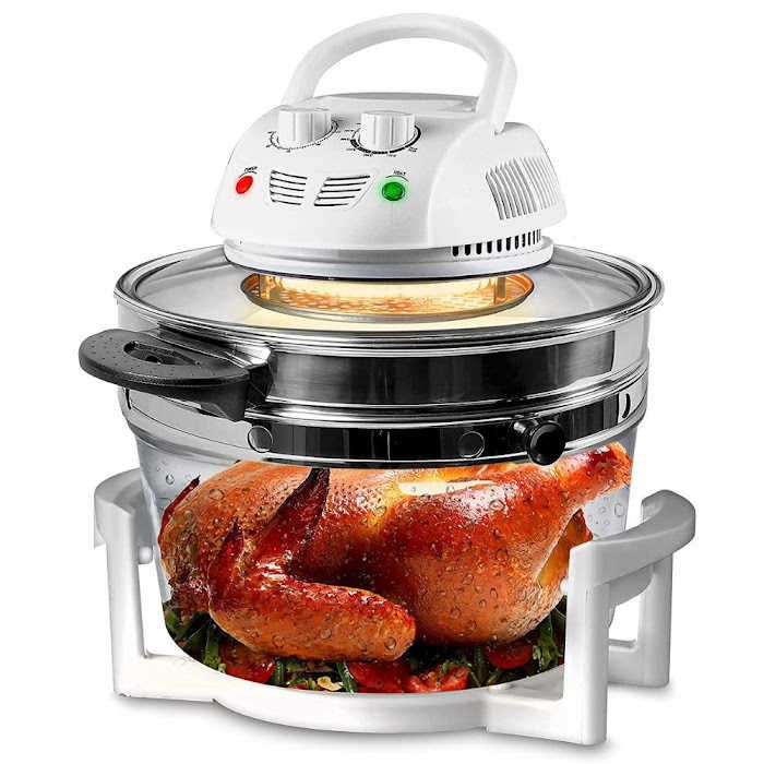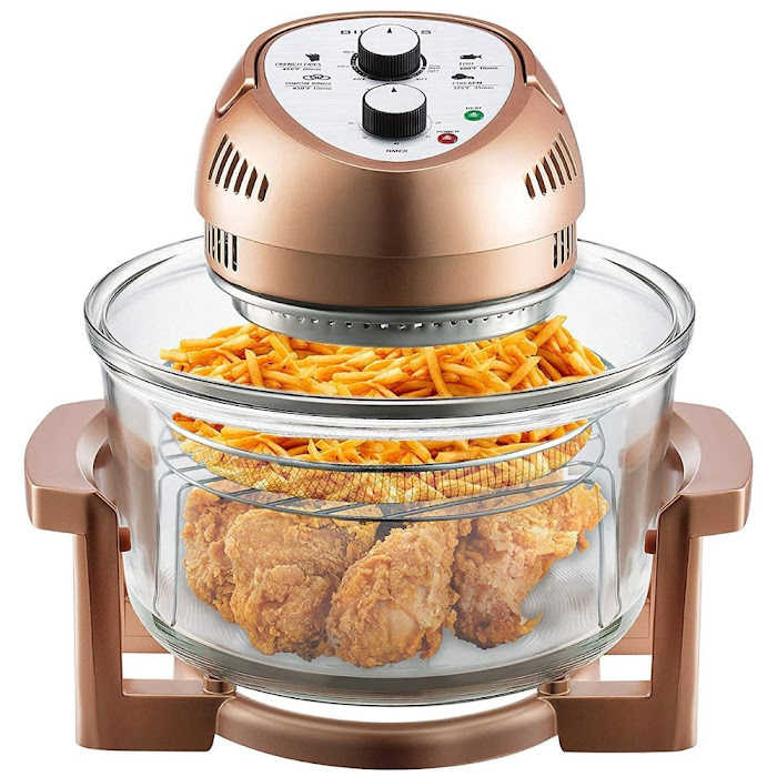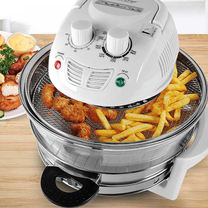 Unlike other types of ovens and toasters, this glass air fryer convection oven does not utilize oil (just a tiny bit for some foods) accumulating excessive amounts of fat. It's ideal for making fries and chips since it browns and crisps the outside while keeping the inside moist.