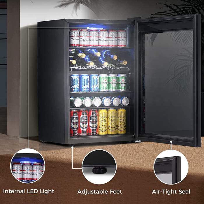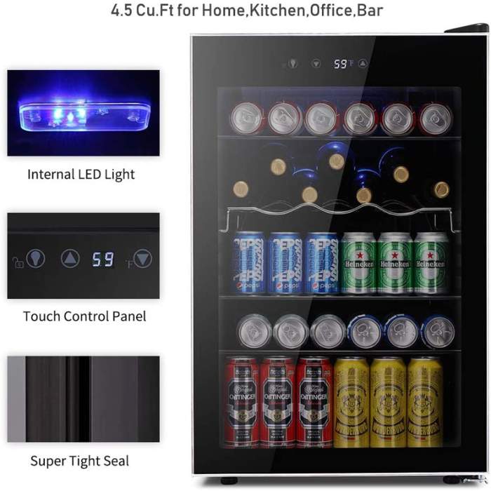 - The spacious interior can hold up to 126 cans or 37 bottles of wine.