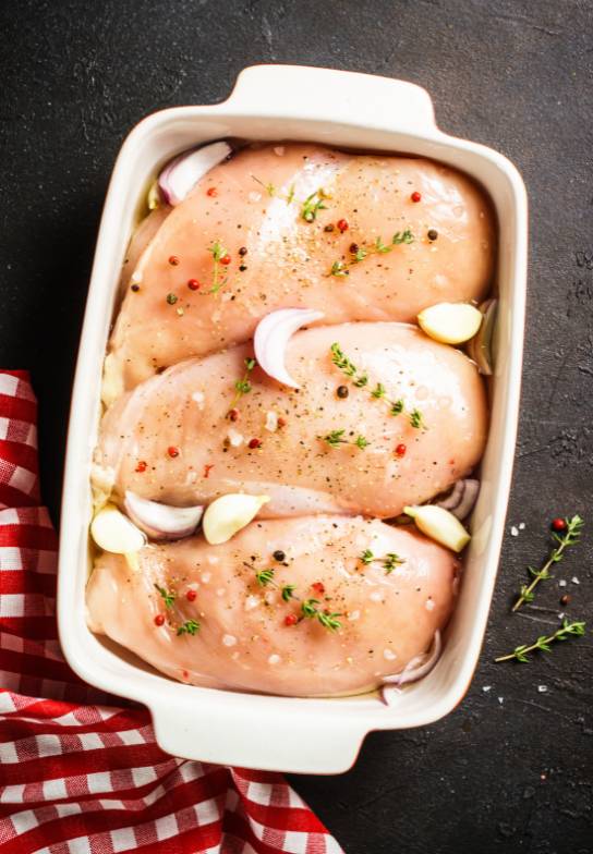 - Season the chicken with salt, pepper, and garlic powder. You can also use a marinade for extra flavor.