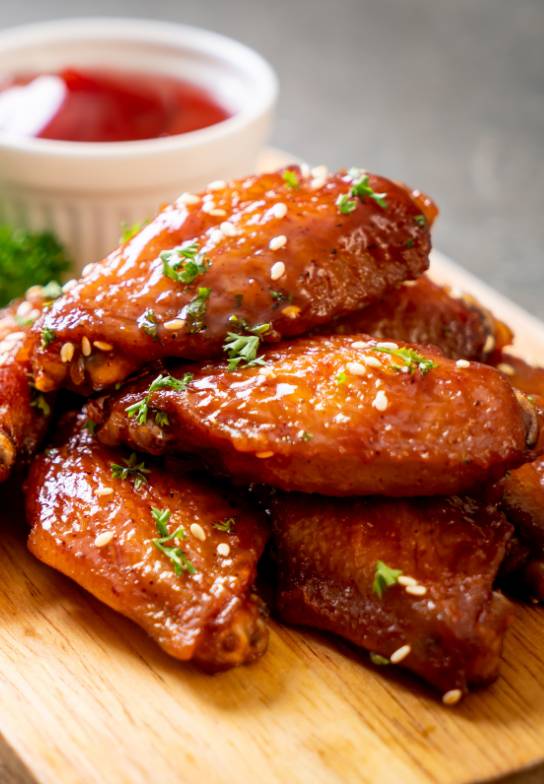 - Once the wings are done, remove them from the oven, toss them in the BBQ sauce mixture, top with sesame seeds, and serve them hot.
