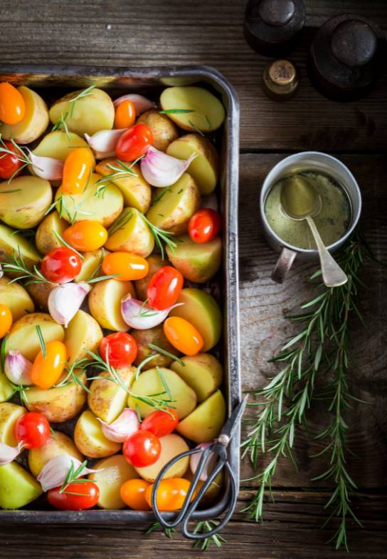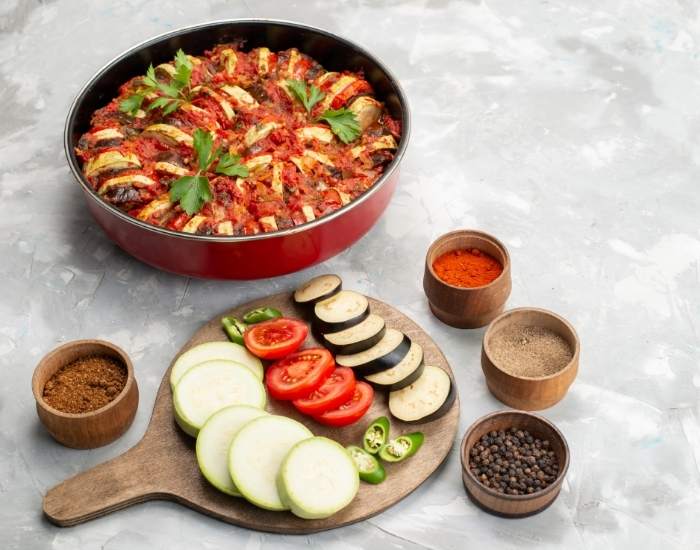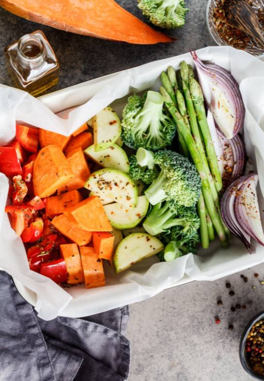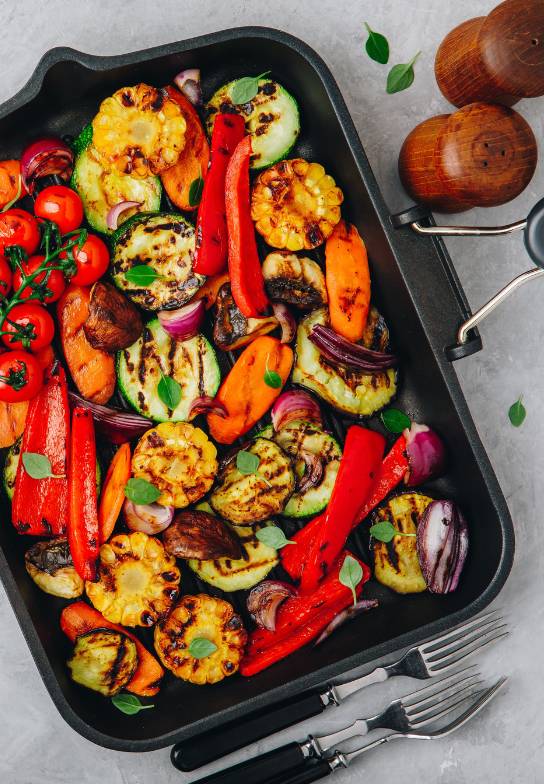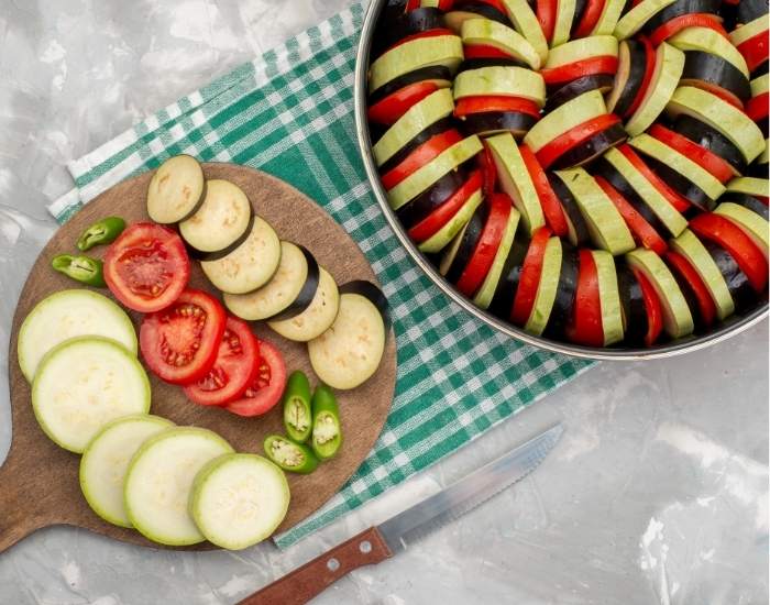 Cut your vegetables into thin slices, and layer them in a baking dish or a cast-iron skillet. Drizzle some olive oil, sprinkle some seasonings, and bake for 30 minutes, or until the vegetables are soft and slightly caramelized.