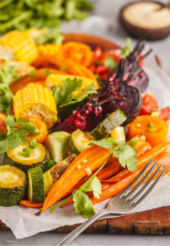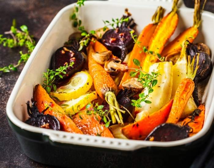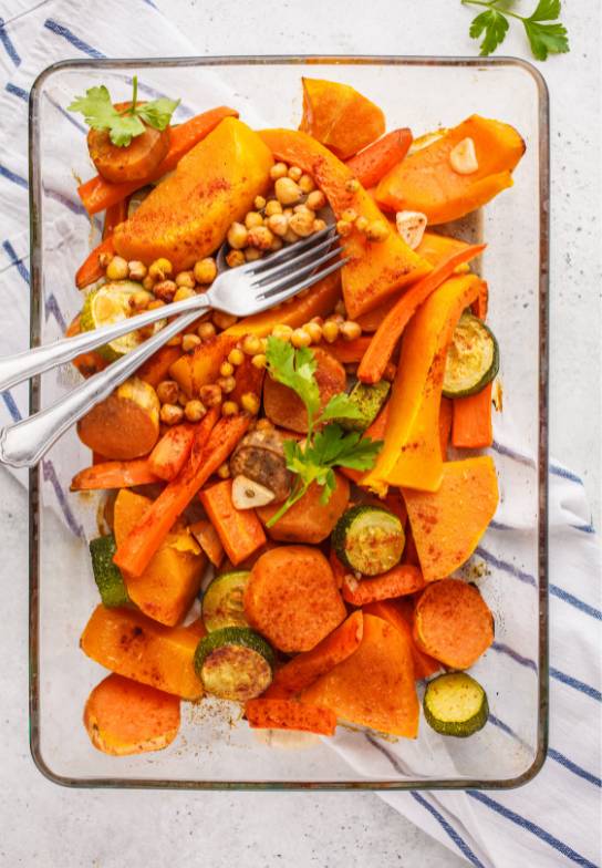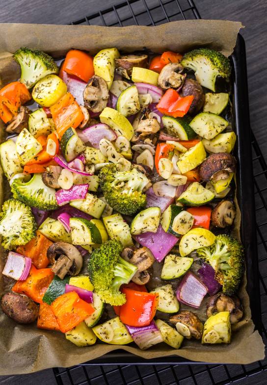 - Bake for 30 minutes, or until the vegetables are tender and slightly browned.