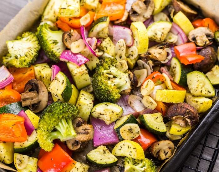 - In a mixing bowl, toss the vegetables together with olive oil, garlic powder, salt, and pepper.