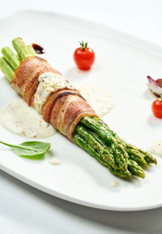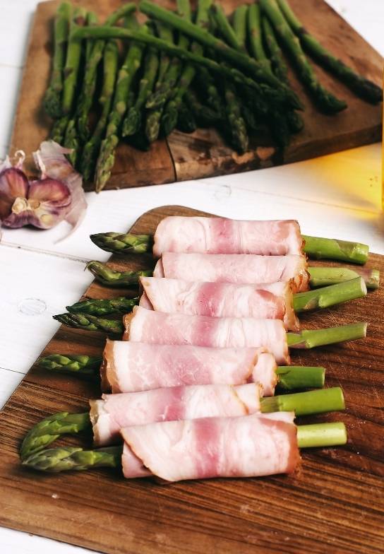 - Wrap each asparagus spear with a slice of bacon.