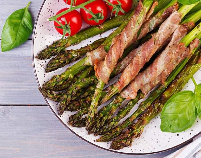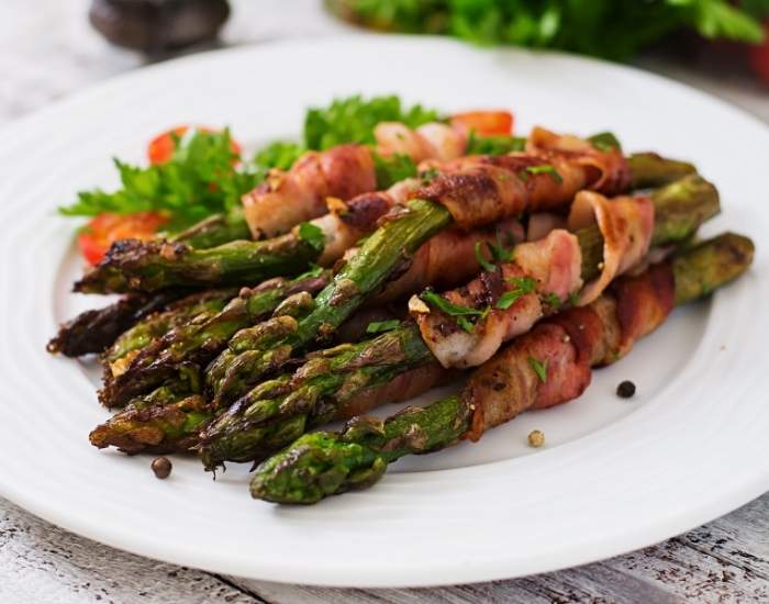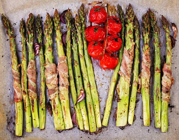 - Bake for 20 minutes or until the bacon is crispy and the asparagus is tender.