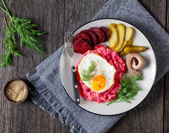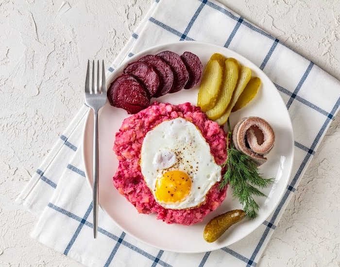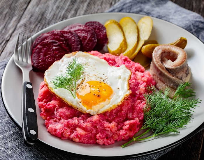 Labskaus is a single-course meal that contains mashed potatoes, corned beef, and beets. The red coloration of the dish comes from beet juice. It is commonly served with accompaniments such as fried eggs, pickles, and pickled herring (rollmops).