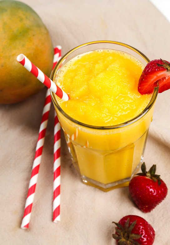 - If you're using frozen mango and strawberries, make sure to let them thaw for about 5 minutes before blending.