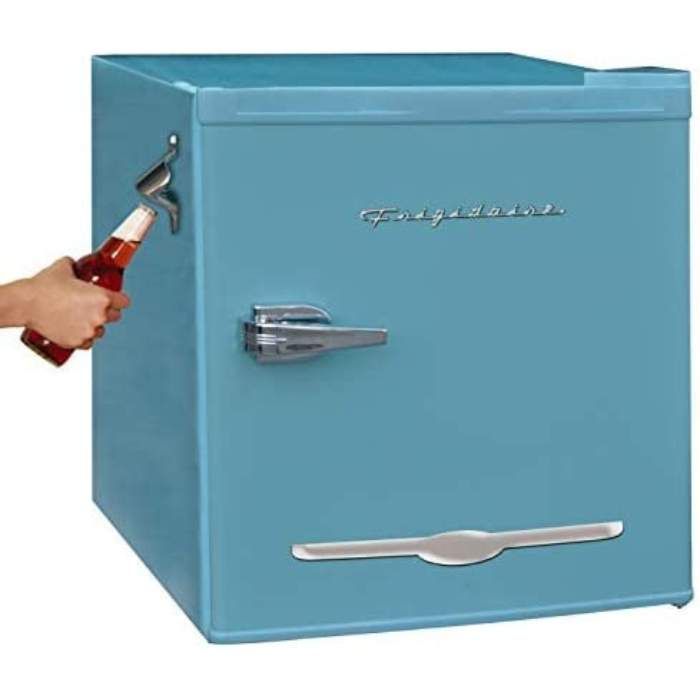 It is a stylish and affordable option for those who are looking for both a vintage design and a practical mini fridge. One of the standout features of this fridge is the built-in bottle opener. It's a handy addition that lets you crack open your drinks without the need for a separate tool.