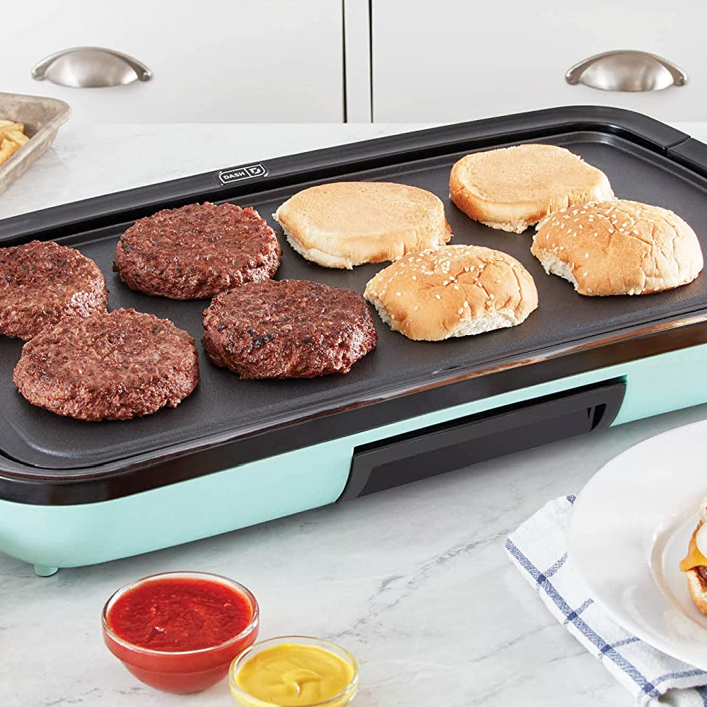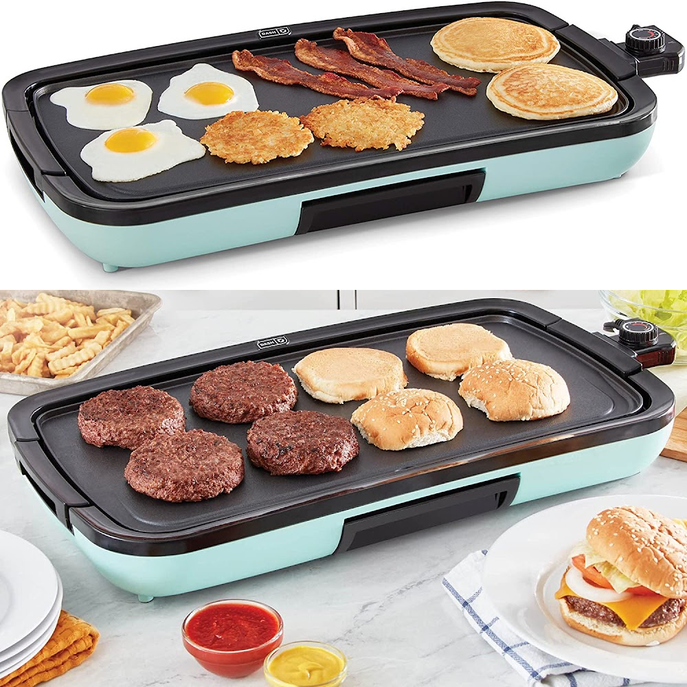 Plus, with its trendy color options of Aqua, Black, Gray, and Red, it makes a great wedding or new home gift. So why wait? Get your hands on the DASH Deluxe Everyday Electric Griddle today!