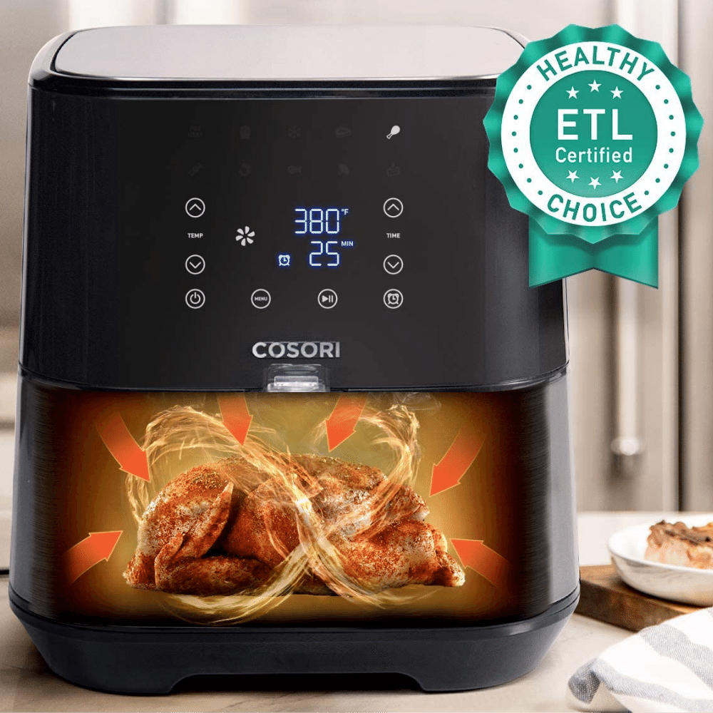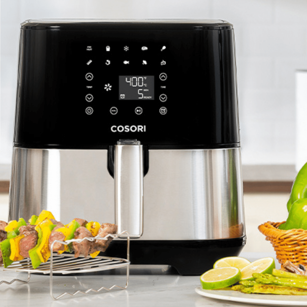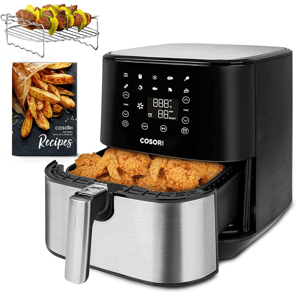 The COSORI Stainless Steel Air Fryer Oven is the ideal tool for those who enjoy home cooking. With its 5.8 quart basket and a rack for rotisserie it can make a meal for up to 4 people.