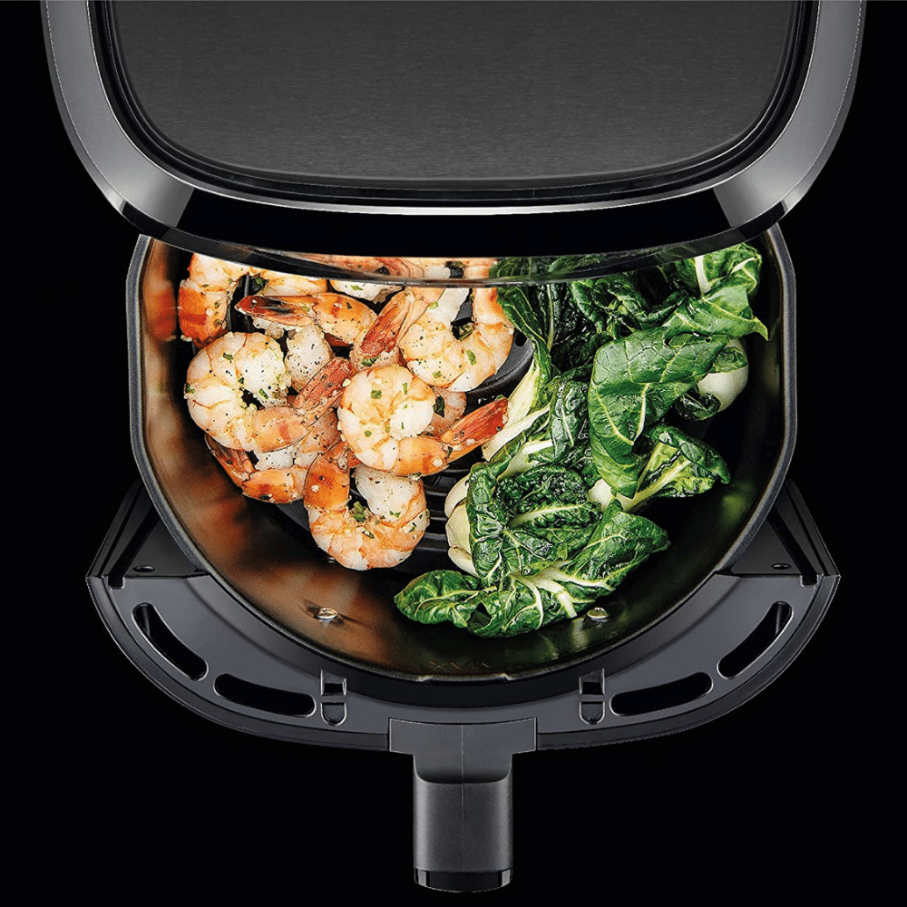 The unique single 10-quart basket has enough capacity to prepare meals for a family or party of 6-8 or to air fry a whole chicken.
