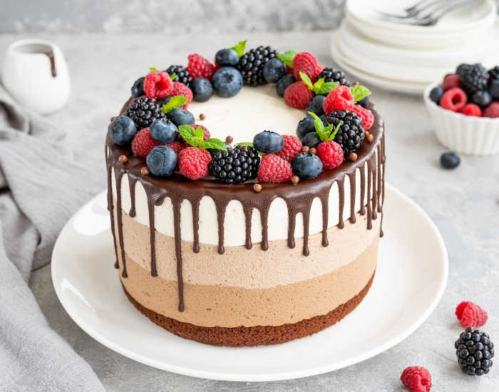 - Remove the multi-layer chocolate cake from the refrigerator and garnish it with fresh mixed berries (optional). Enjoy!