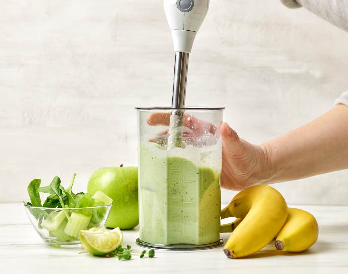 An immersion blender with multiple speed settings and a long shaft and blade make it easy to blend ingredients directly in the pot.